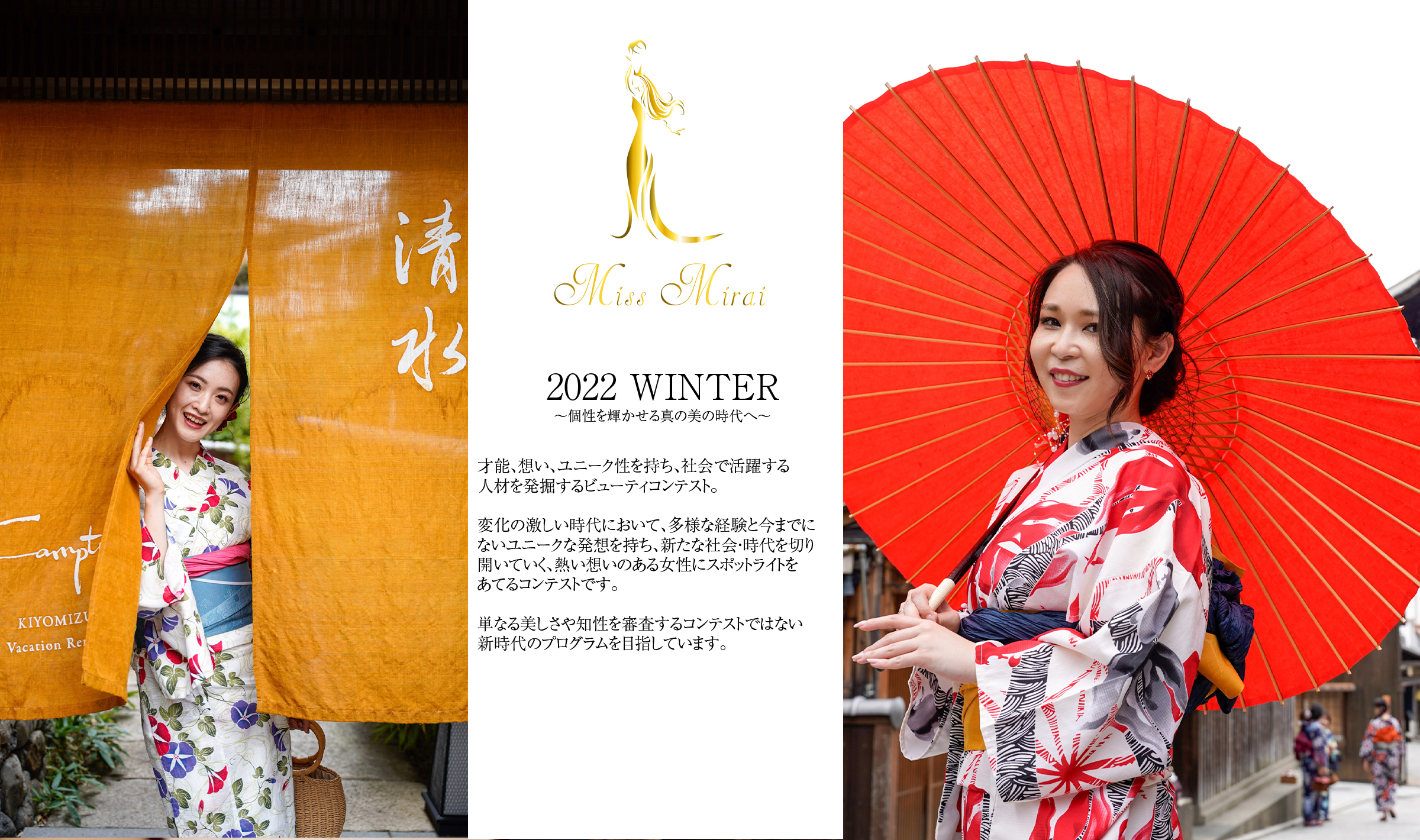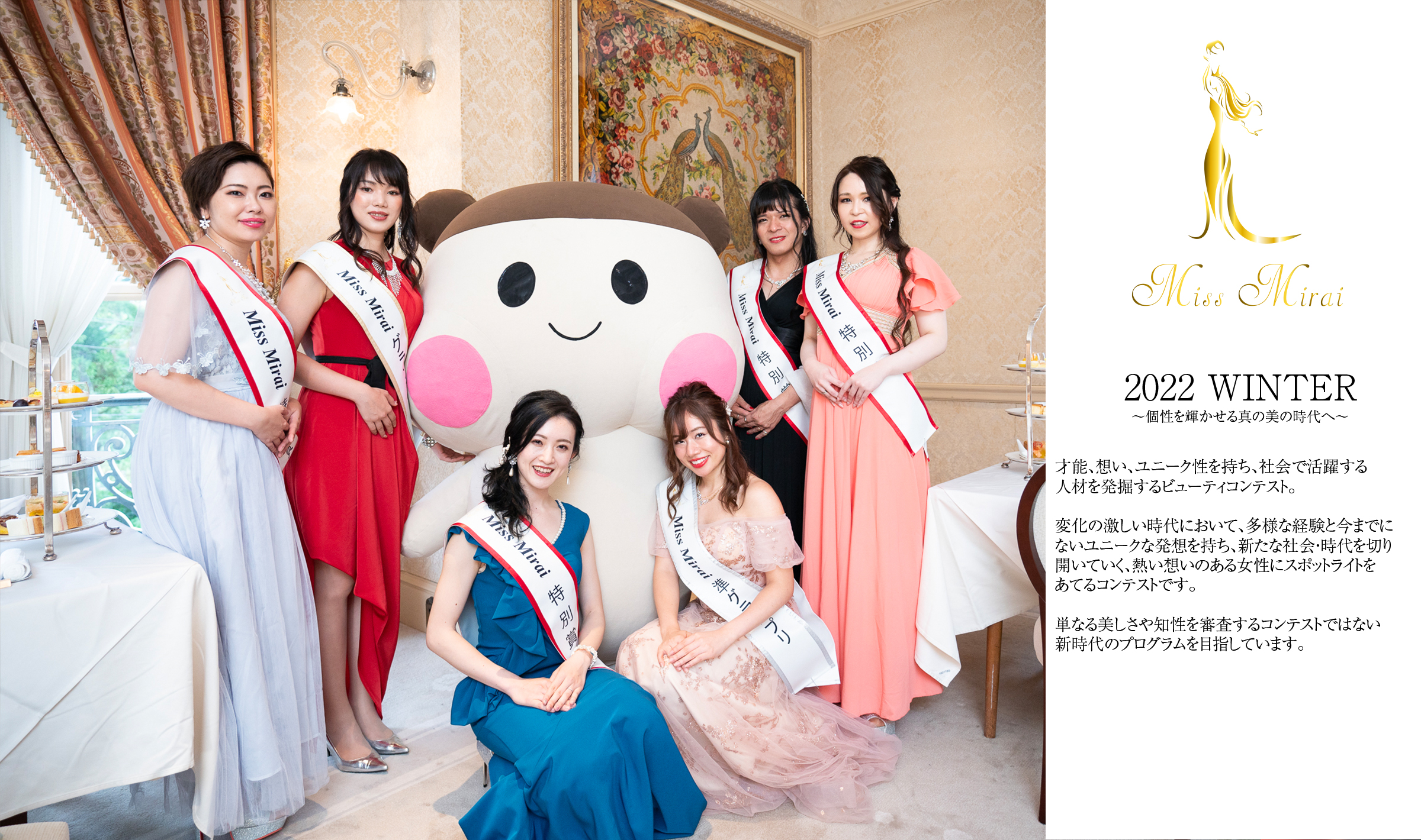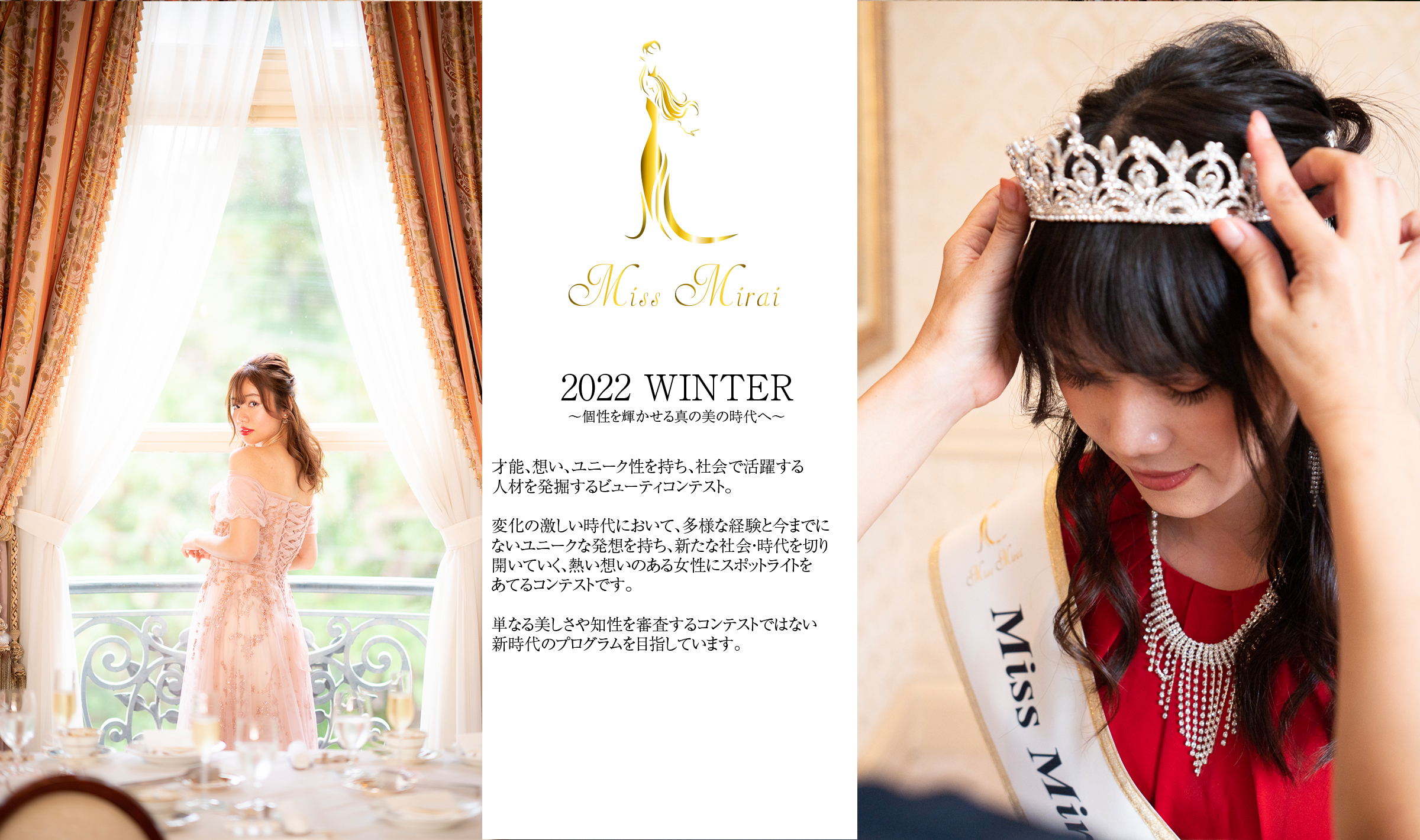 top_slider05header-02top_slider04header-04 \第2回ミスミライ全国大会 2022年2月12日(土)配信動画/ 是非、ファイナリストたちの熱い想いを聞いてください^^ 観客の方、その他どなたでも下記のライブ配信はご覧になれます。 https://www.youtube.com/watch?v=EJSgFQHH4ek Concept理念 このミスミライは、才能、ユニーク、想いを持ち、社会で活躍する人材を発掘し、活躍の場の提供を目視とした団体。 変化の激しい時代において、多様な経験と今までにないユニークな発想を持ち、新たな社会・時代を切り開いていく、熱い想いのある女性にスポットライトをあてるコンテストです。 単なる美しさや知性を審査するコンテストではない新時代のプログラムを目指しています Flow次回第3回大会募集 書類審査 書類審査5月末応募締め切り 面接 6月面接・質疑応答2次審査 全国大会 2022年7月30日開催 Contestコンテスト募集 Overview概要 このミスミライは、才能、ユニーク、想いを持ち、社会で活躍する人材を発掘し、活躍の場の提供を目視とした団体。 変化の激しい時代において、多様な経験と今までにないユニークな発想を持ち、新たな社会・時代を切り開いていく、熱い想いのある女性にスポットライトをあてるコンテストです。 単なる美しさや知性を審査するコンテストではない新時代のプログラムを目指しています 応募資格 ・国籍不問・2022年7月1日時点で18歳~38歳の女性の方※芸能事務所所属可※既婚者可※未成年は保護者の同意書が必要※登録費無料 全国大会審査内容 ■ 1次審査 筆書類審査 ■ 2次審査 面接・質疑応答審査 ■ セミファイナリスト審査上位20名ファイナリスト選抜 タイトル受賞後 ・1年間は団体での活動を行っていただきます・スポンサー企業様のPR活動・地域PR活動・その他メディア活用PRモデル。 etc... 優勝者 賞金10万円嵐電広告モデル各スポンサー賞の方・1年間アンバサダーその他豪華賞品 ■ 寄付先全国児童養護施設総合寄付サイト 巣立ち基金 fa-arrow-circle-rightContactお問い合わせ ENTRYエントリーする ミスミライスポンサー